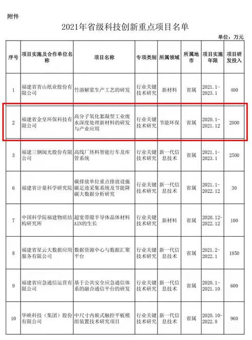 近日,福建省工業(yè)和信息化廳以《閩工信函科技〔2021〕476號》文發(fā)布了《關(guān)于印發(fā)2021年省級科技創(chuàng)新重點項目的通知》,金皇環(huán)保自主研發(fā)項目“高分子氧化絮凝型工業(yè)廢水深度處理新材料的研發(fā)與產(chǎn)業(yè)應用”成功入選。
