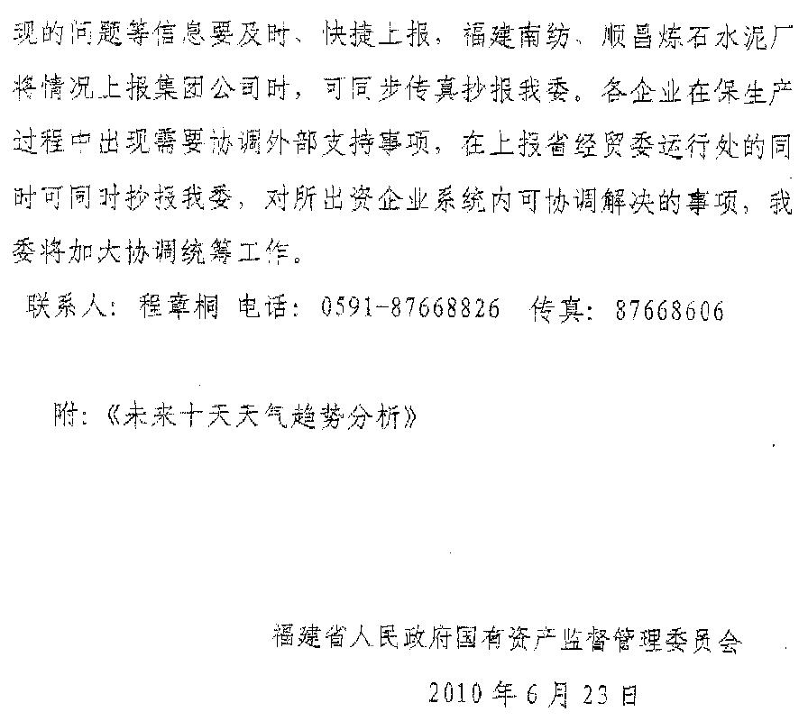 現將福建省人民政府國有資產監督管理委員會《關于繼續做好汛期抗災工作的緊急通知》(閩國資明電〔2010〕4號)轉發給你們。各企業要認真貫徹《通知》精神,堅決貫徹省委、省政府關于防汛救災的一系列部署,克服僥幸、麻痹、松懈思想,克服厭倦、畏難情緒,加大巡查力度,針對有可能發生的地質災害,要采取果斷措施,把職工群眾生命安全放在第一位,及時轉移人員和財產,確保人員安全和財產損失降低到最低程度。